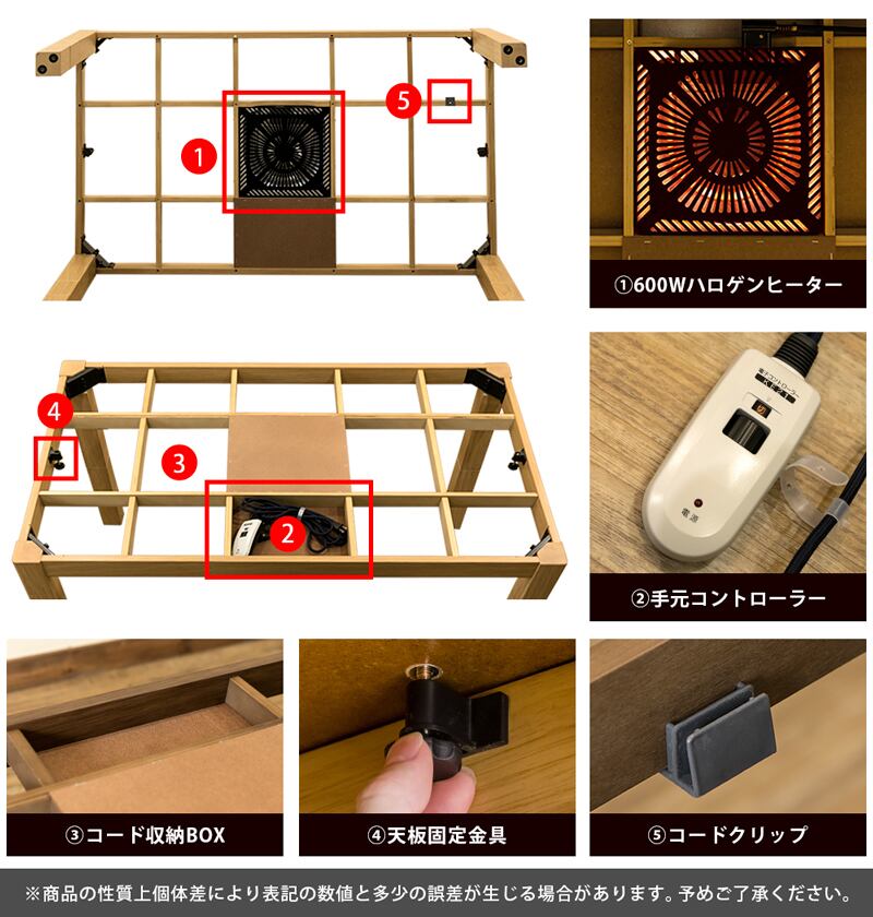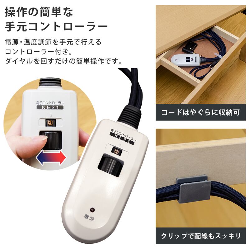 こたつとして使わない時期には、天板をしっかり固定できる金具付きで、普段使いのテーブルとしても安心。コードも本体内に収納できるので、スッキリ使えます◎